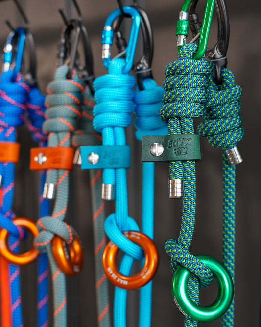 Handmade rope keyrings using recycled offcuts from our best-selling climbing rope dog leads.